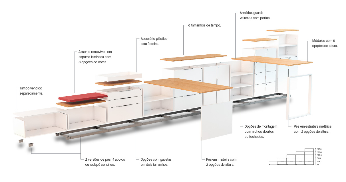Um sistema de mobiliário inteligente e modular, onde você mesmo é quem cria a solução de acordo com as suas necessidades, independente do tamanho do seu projeto.