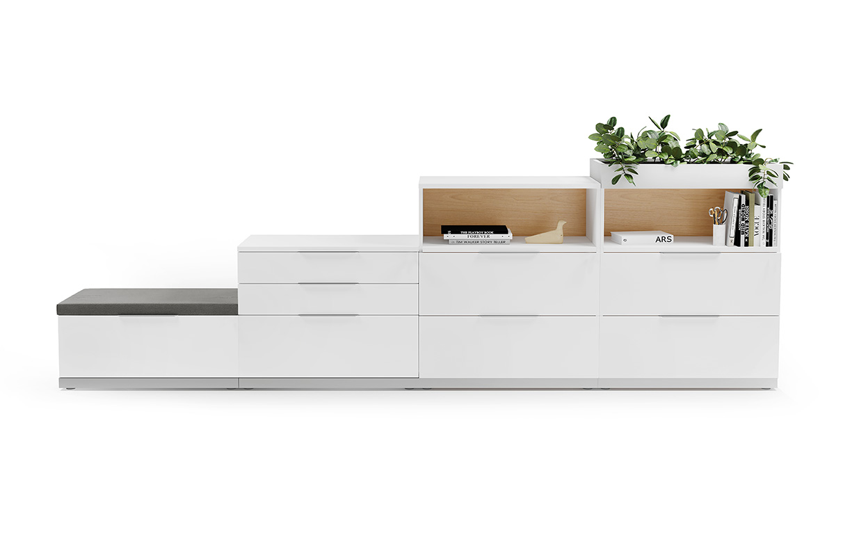 Confeccionada com MDP de altíssima qualidade, puxadores em alumínio e bases metálicas revestidas com pintura eletrostática à pó, o sistema da Linha Places tem diversas alturas, é fácil de combinar e permite variações infinitas.