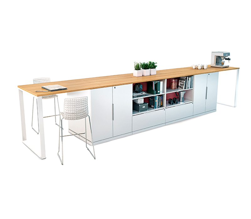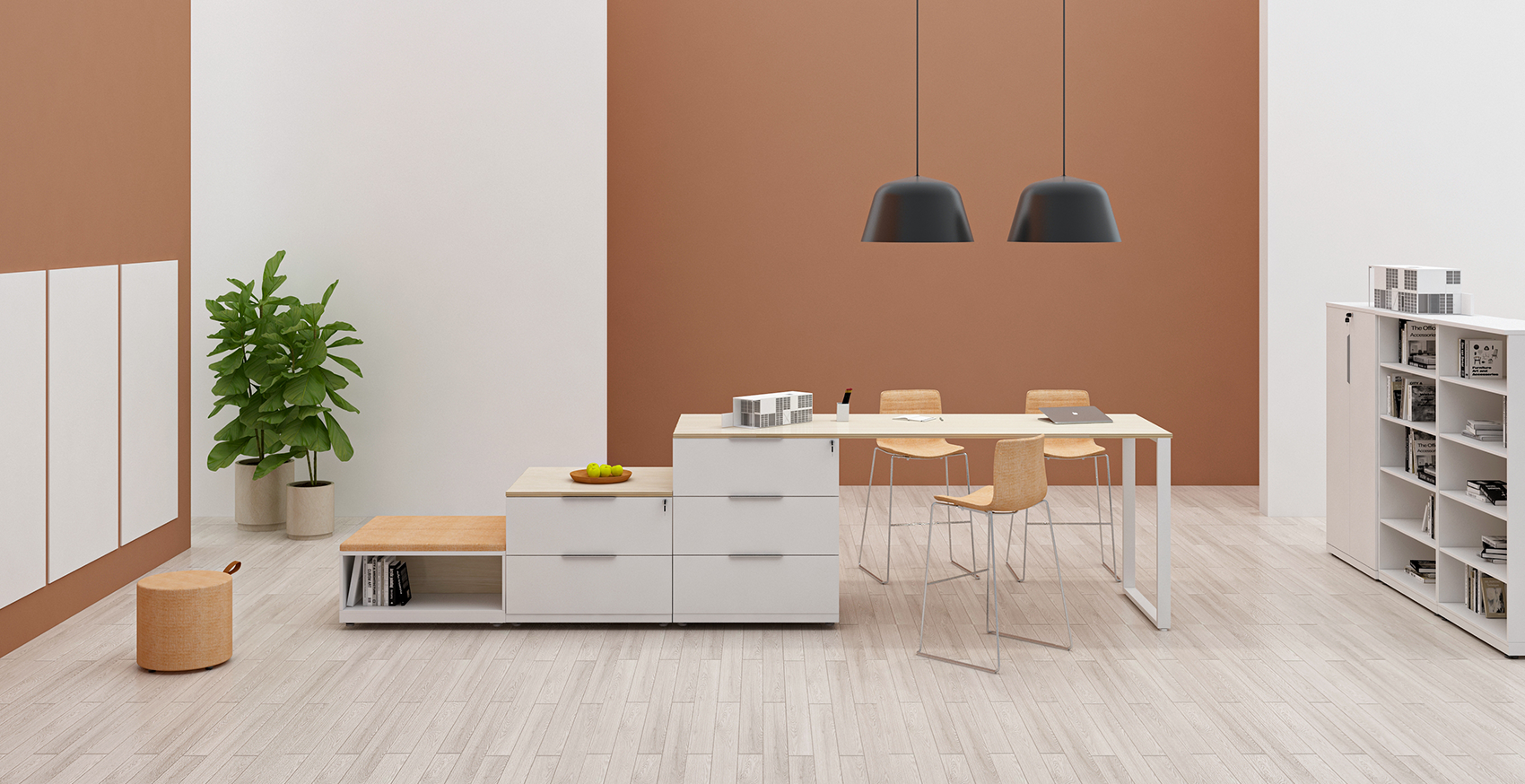 Leveza nas formas e infinitas possibilidades para espaços de descompressão, work café, arquivamento, reuniões e bancadas para trabalhos temporários.