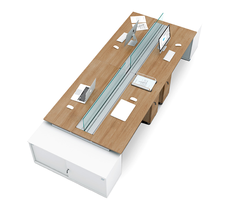 Painéis divisores em vidro 8mm e MDP sem perfis aparentes.